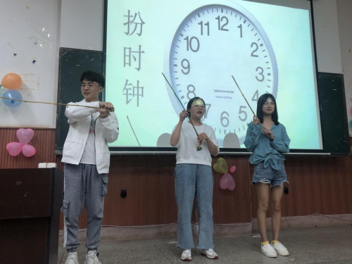 感动过后,主持人带领同学们开始了小游戏环节。扮时钟、指挥行动、三人抱团,三个小游戏让同学们玩得不亦乐乎,惊喜与惊叫不断。一组参与游戏的同学没有快速指出老师说出的时间,接受惩罚为同学表演节目,另外一组同学则是没有按照游戏规则指挥行动,也只好为大家表演了一段舞蹈,逗得大家哈哈大笑。最精彩的该是三人抱团游戏,同学们既要关注主持人说出的数字,还要马上和周围的人抱团成功,开启抢人模式,真是不容易啊。