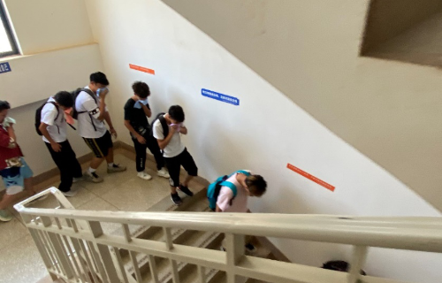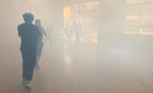 第二阶段为实地演练。保卫处黄老师在现场指导身着引导服的引导员到各楼道口,指挥师生员工如何进行疏散逃生,发现不正确动作现场及时纠正。在警示哨声响起后,学生按要求捂住口鼻靠墙有序撤离实验室,并在3分钟内有序撤离模拟火场,到达指定安全地带,演练顺利完成。