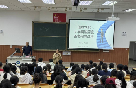 云中讯(通讯员:李爽 普奕)为加强学风建设,使学生掌握大学英语四级备考策略,提高备考效率,同时培养良好的学习习惯,信息学院于2024年10月28日在弘毅楼1111教室举行“信息学院大学英语四级备考指导讲座”,本次讲座由外语部副主任黄兴亚老师主讲,信息学院党总支书记赵文娟主持,学院2024级全体同学参加。