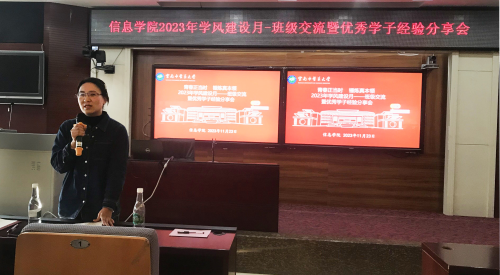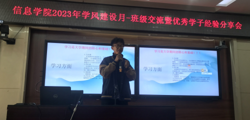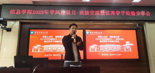 云中讯(通讯员 杨明蔷、杨吉蕊)为进一步加强学院学风建设,营造良好学习氛围,提高学习动力,帮助学生更好地学习专业课,找到适合自己的学习方法,提升实践技能。11月23日,信息学院开展学风建设月——班级交流暨优秀学子经验分享会。出席会议的老师有党总支副书记杨莉,辅导员普奕、赵双双,班主任代表:陈梦蓉、唐愉顺,优秀学子代表:马梓玉、吕荣飞、李超威、景超、汪郅、童绍尧,其中李超威和景超,分别来自第一临床医学院和第二临床医学院,两名均是学校2023届优秀毕业生,学校官微表扬“考研集体上岸”的优秀学生代表,会议由高云英老师主持。